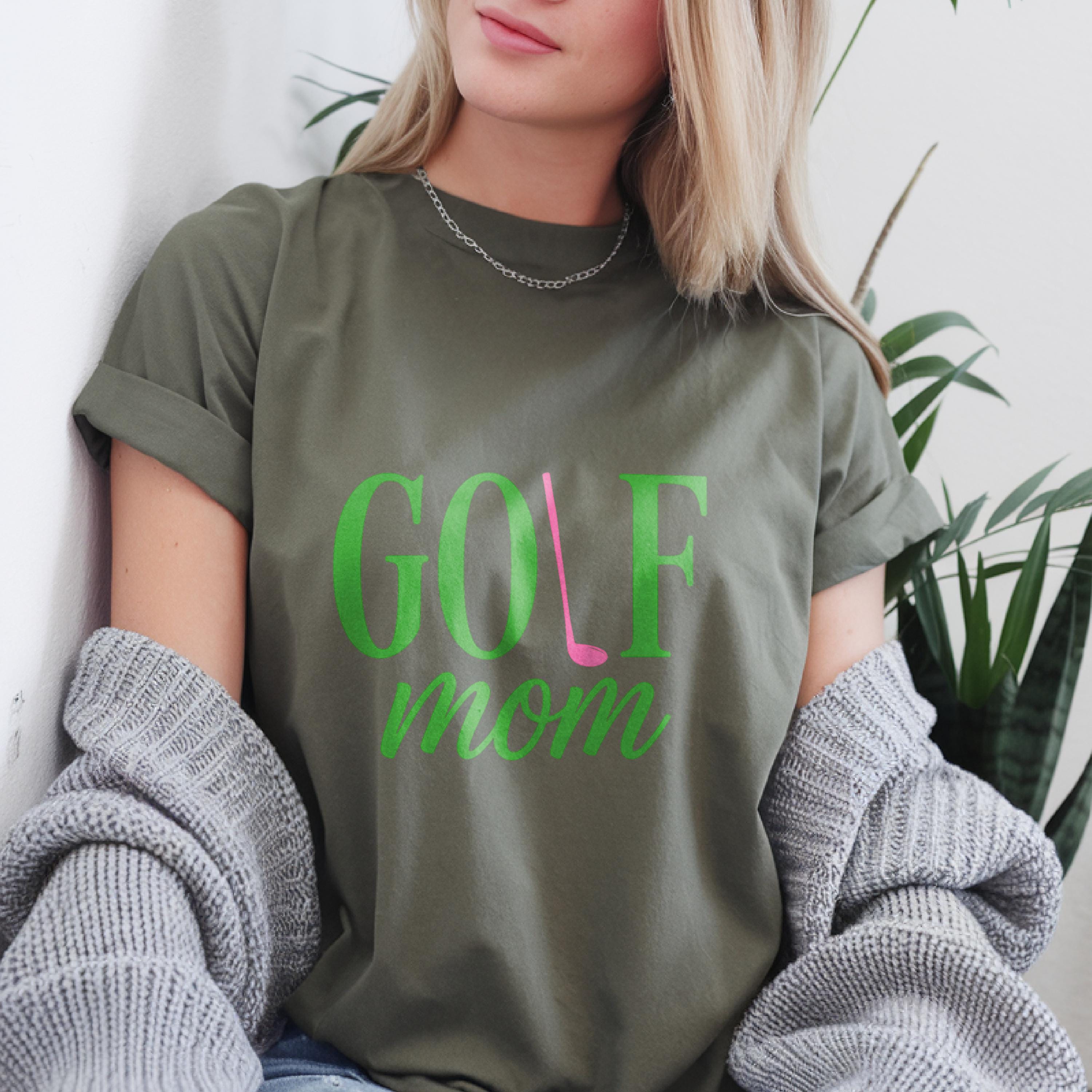 Celebrate mom in style with our Golf Mama T-Shirt – the perfect gift for any woman who loves golf and rocks motherhood like a pro! This trendy tee combines sporty vibes with a feminine touch, featuring a fun “GOLF mom” design where a pink golf club adds a playful twist.