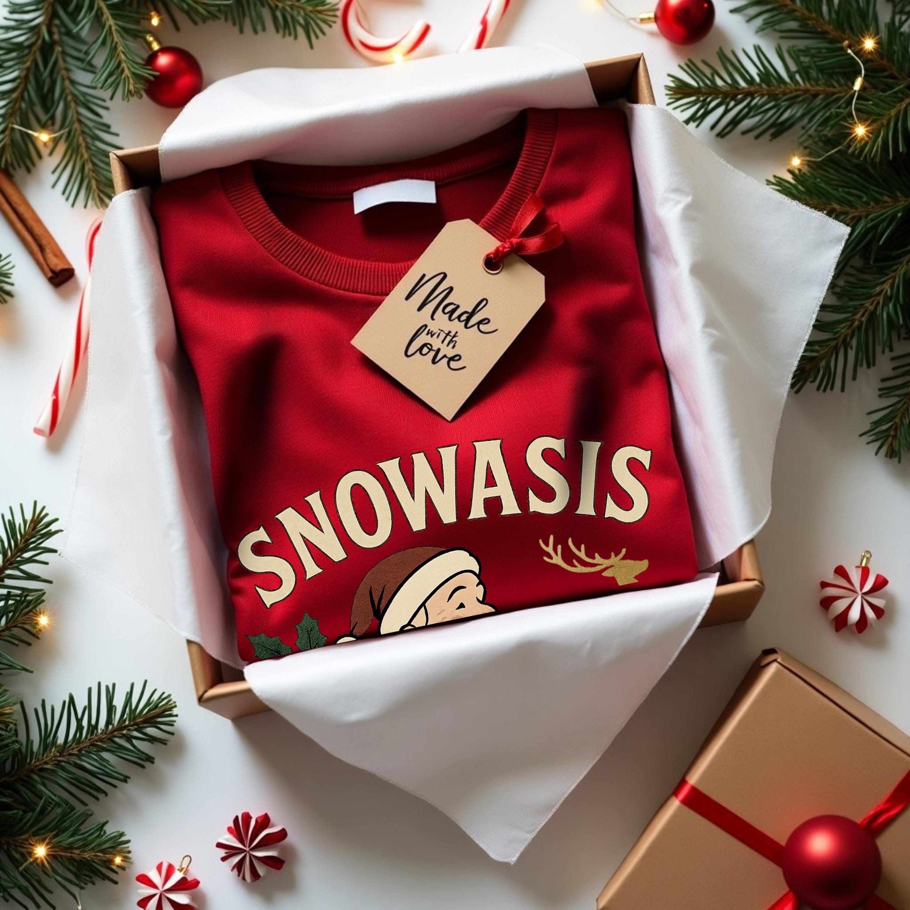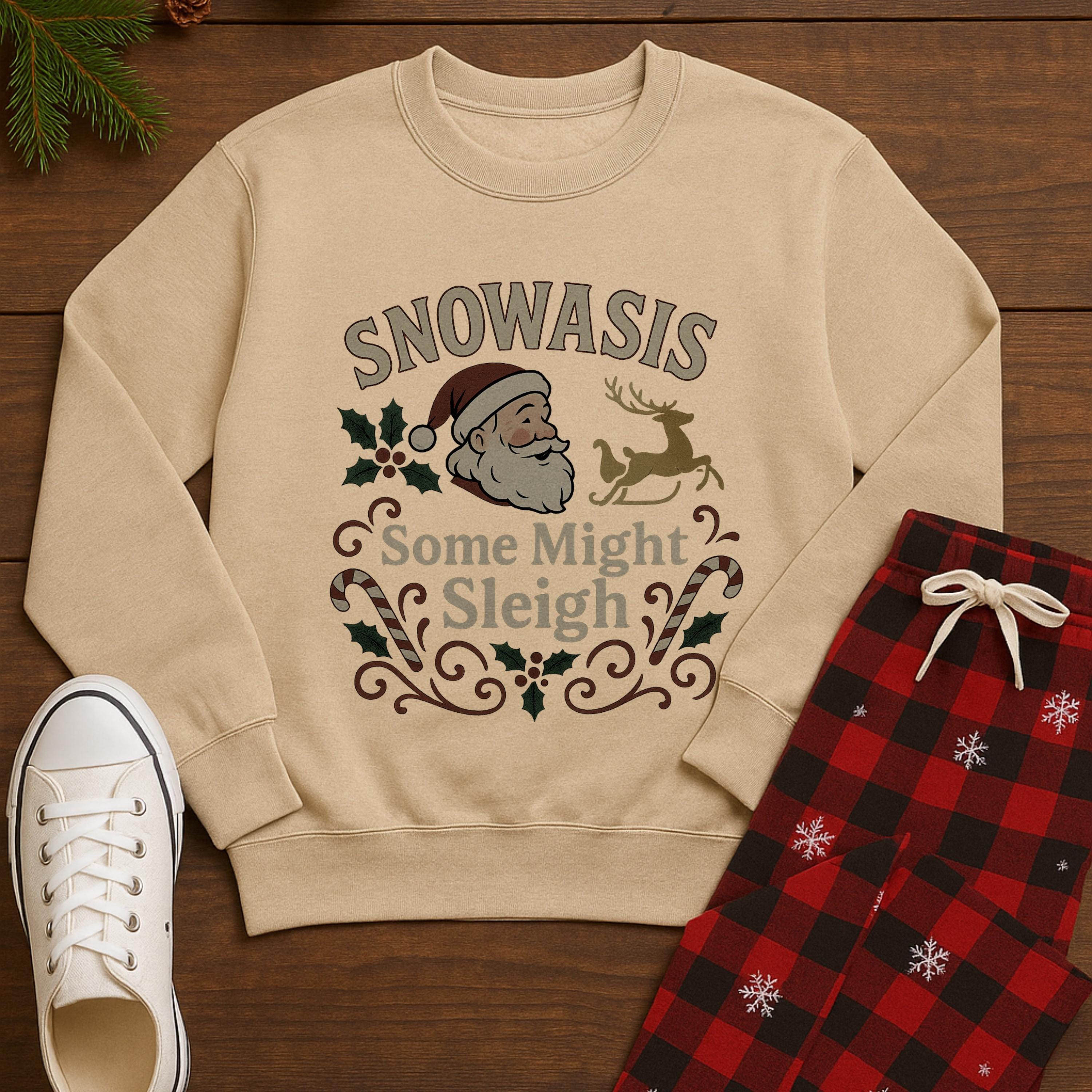 Bring some laughter to the holidays with this hilarious “Snowasis – Some Might Sleigh” design! A clever Christmas pun featuring Santa, his sleigh, reindeer, holly, and candy canes — perfect for anyone who loves witty holiday humor.