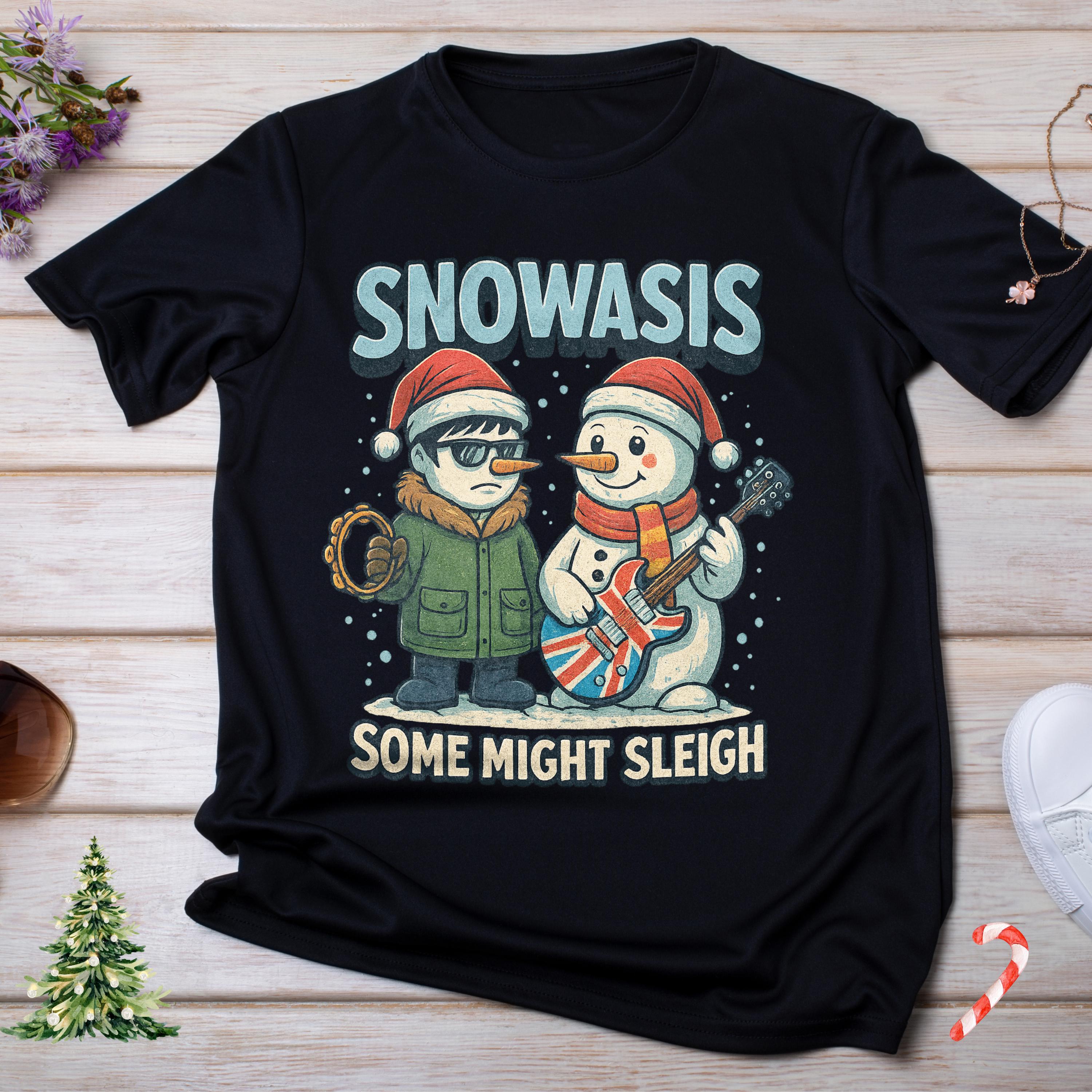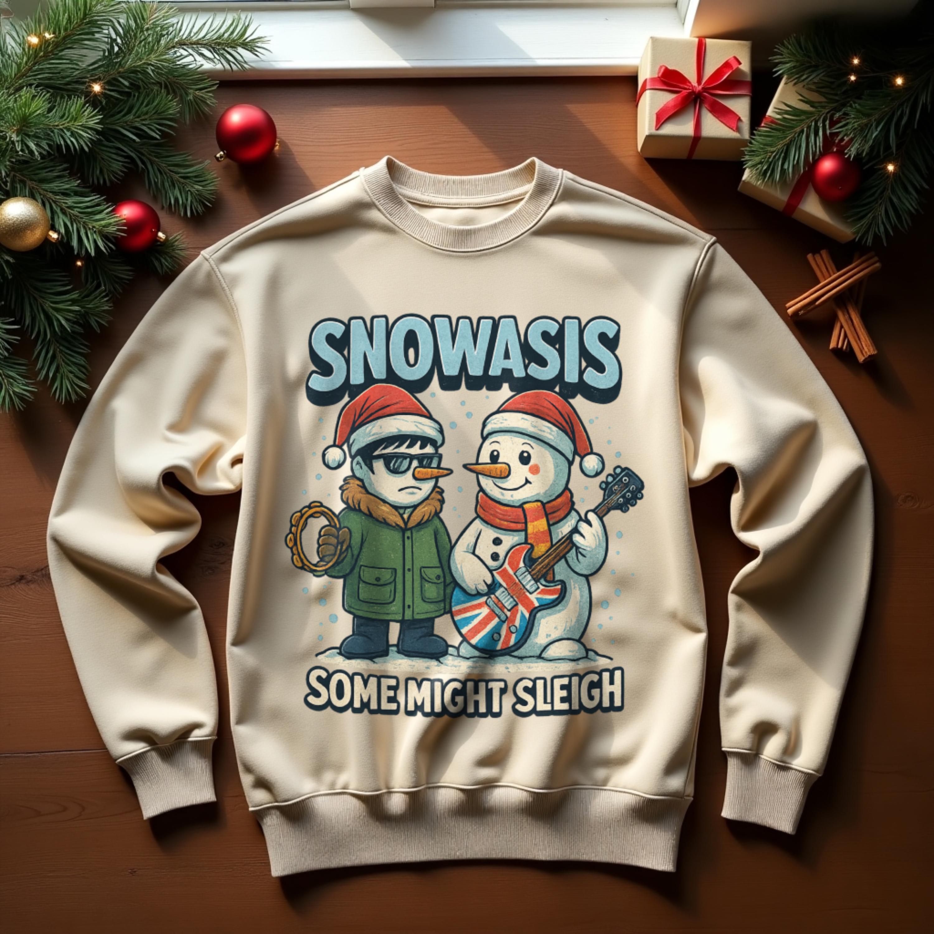 Funny Christmas Sweatshirt SNOWASIS “Some Might Sleigh” – Snowman Rock Band Parody Holiday Tee / Jumper for Music Fans