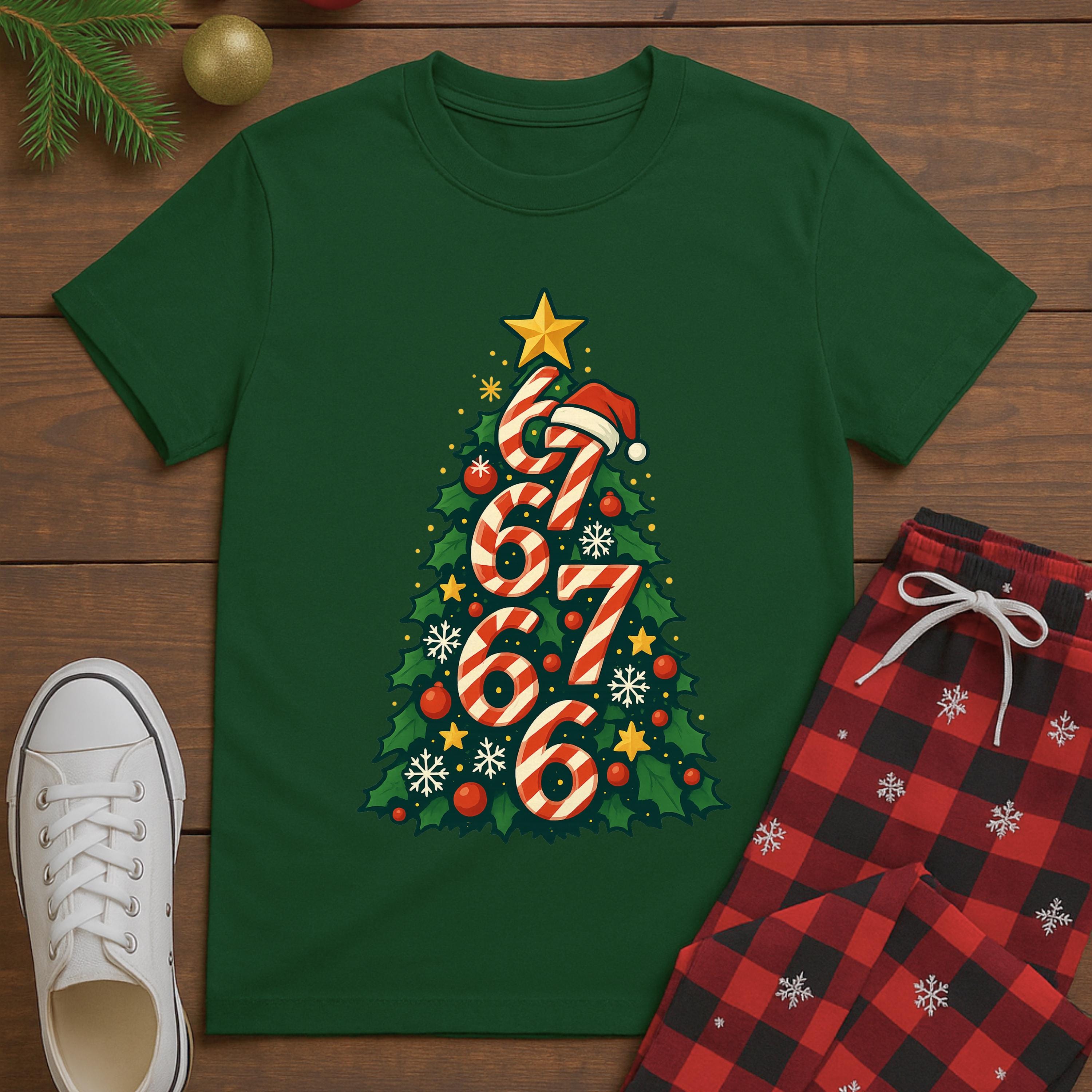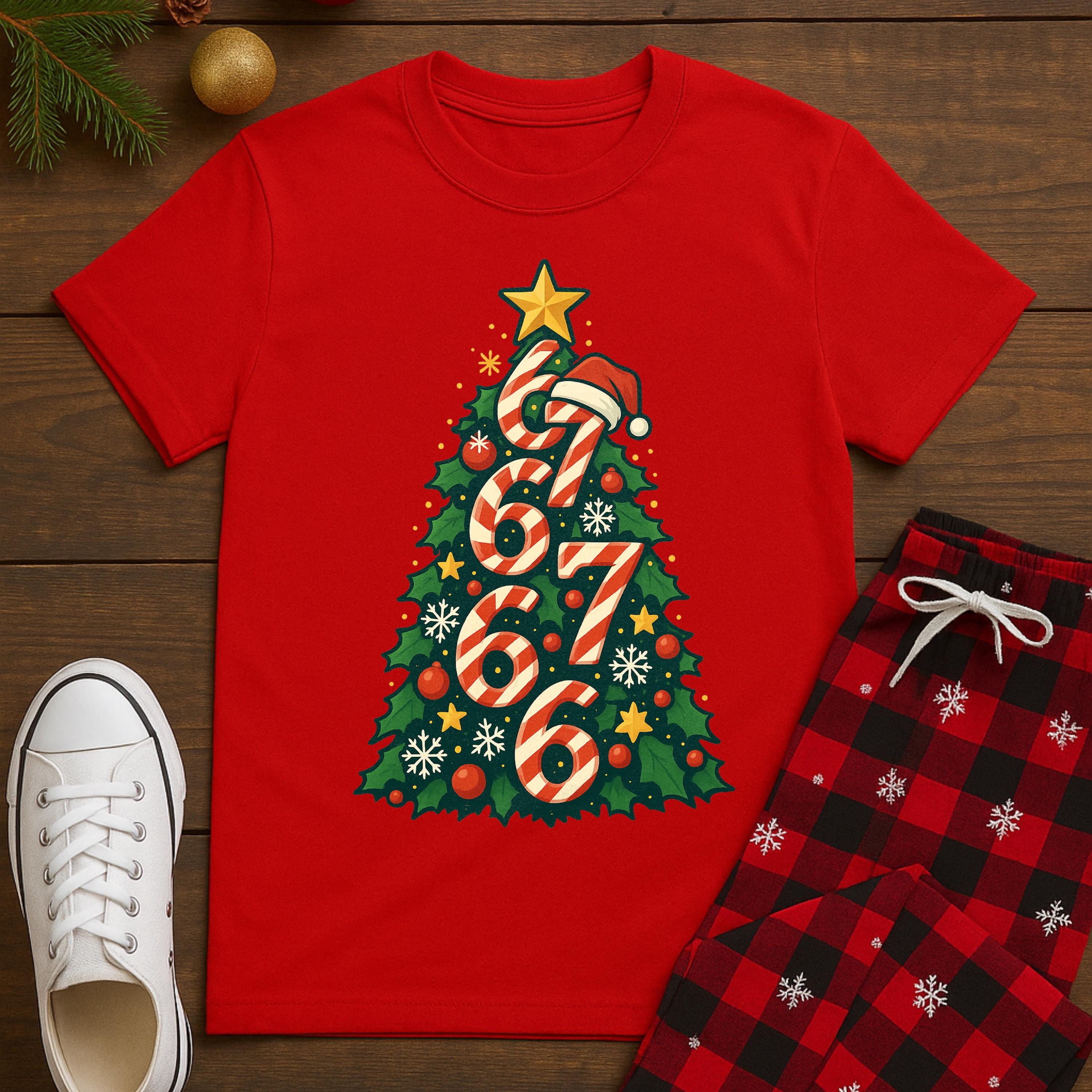 This Candy Cane 677 Christmas Tree design blends bold streetwear style with cozy Christmas vibes. The candy-cane numbers form a festive tree topped with a Santa hat and star — playful, eye-catching, and perfect for parties, photos, or chilling all December long.