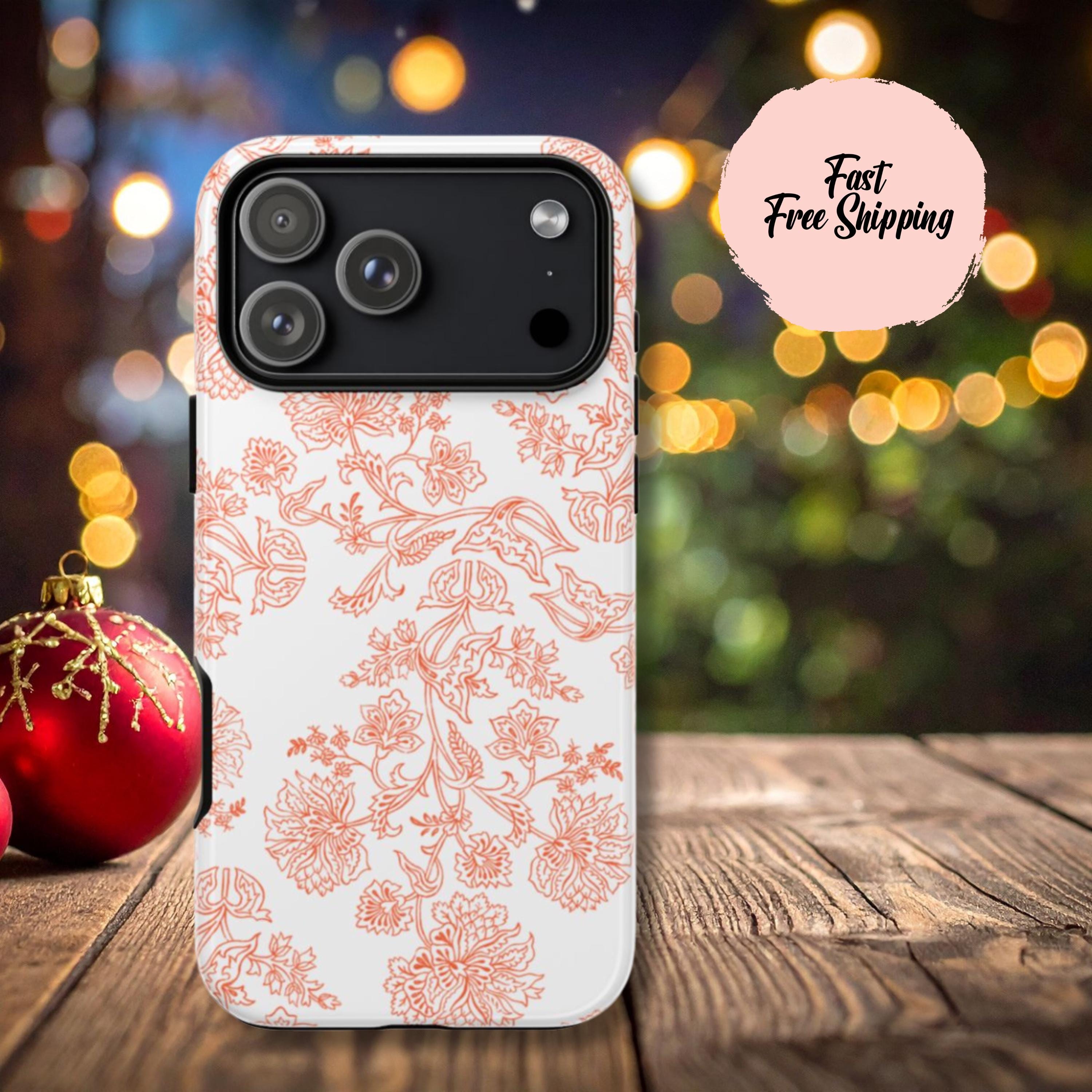 Vintage Floral Tough Phone Case, Orange Line Art Flower Cover, Elegant Botanical iPhone & Samsung Case, Aesthetic Protective Phone Gift