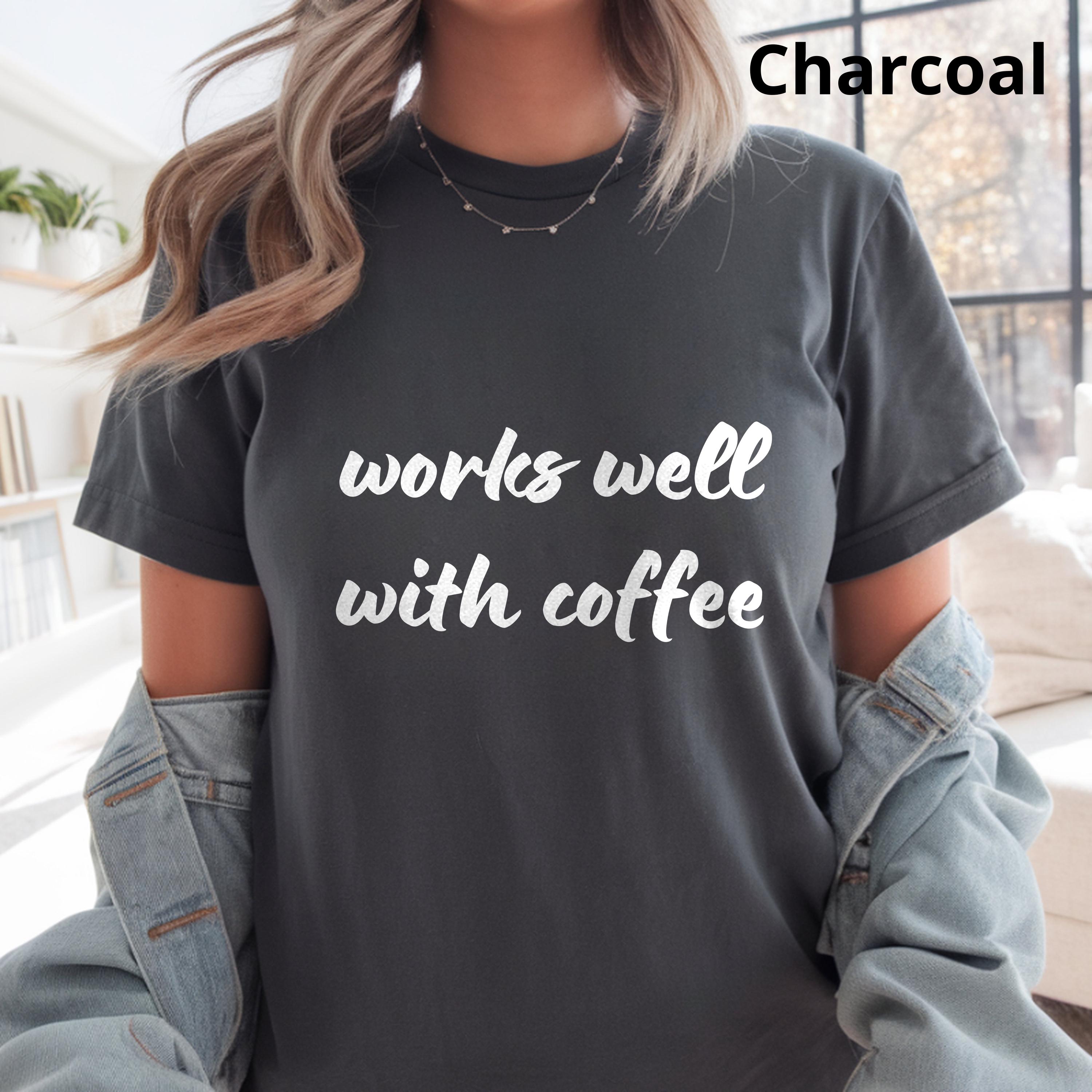 coffee tshirt, works well with coffee, funny coffee shirt, caffeine lover tee, coffee addict gift, barista shirt, morning coffee tee, minimalist graphic shirt, humor tshirt, cute coffee lover gift, coffee quote shirt, comfy casual tee, trending coffee shirt
