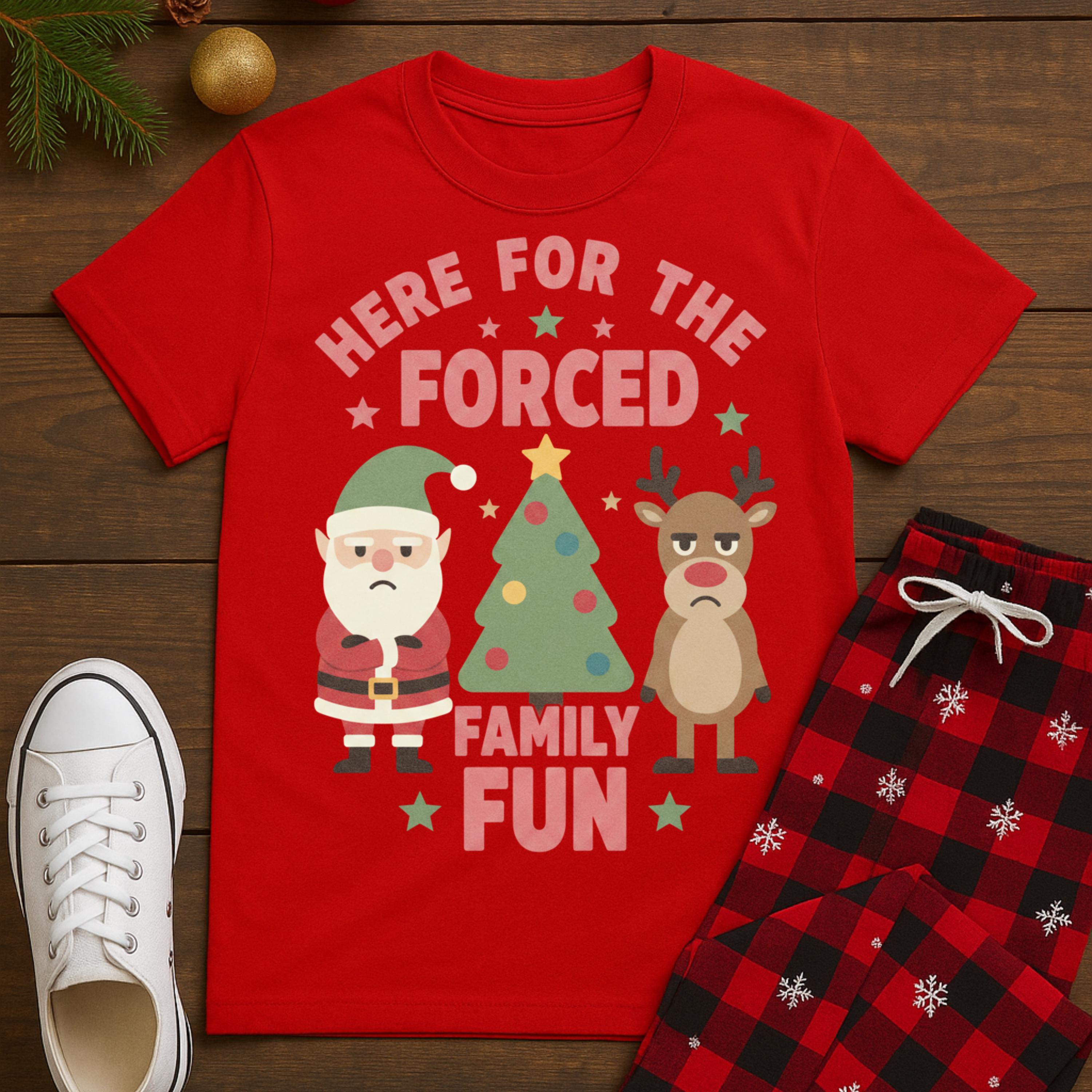 Funny Christmas Gathering Shirt Here For The Forced Family Fun T-Shirt, sarcastic holiday Gift, festive humor Graphic Tee