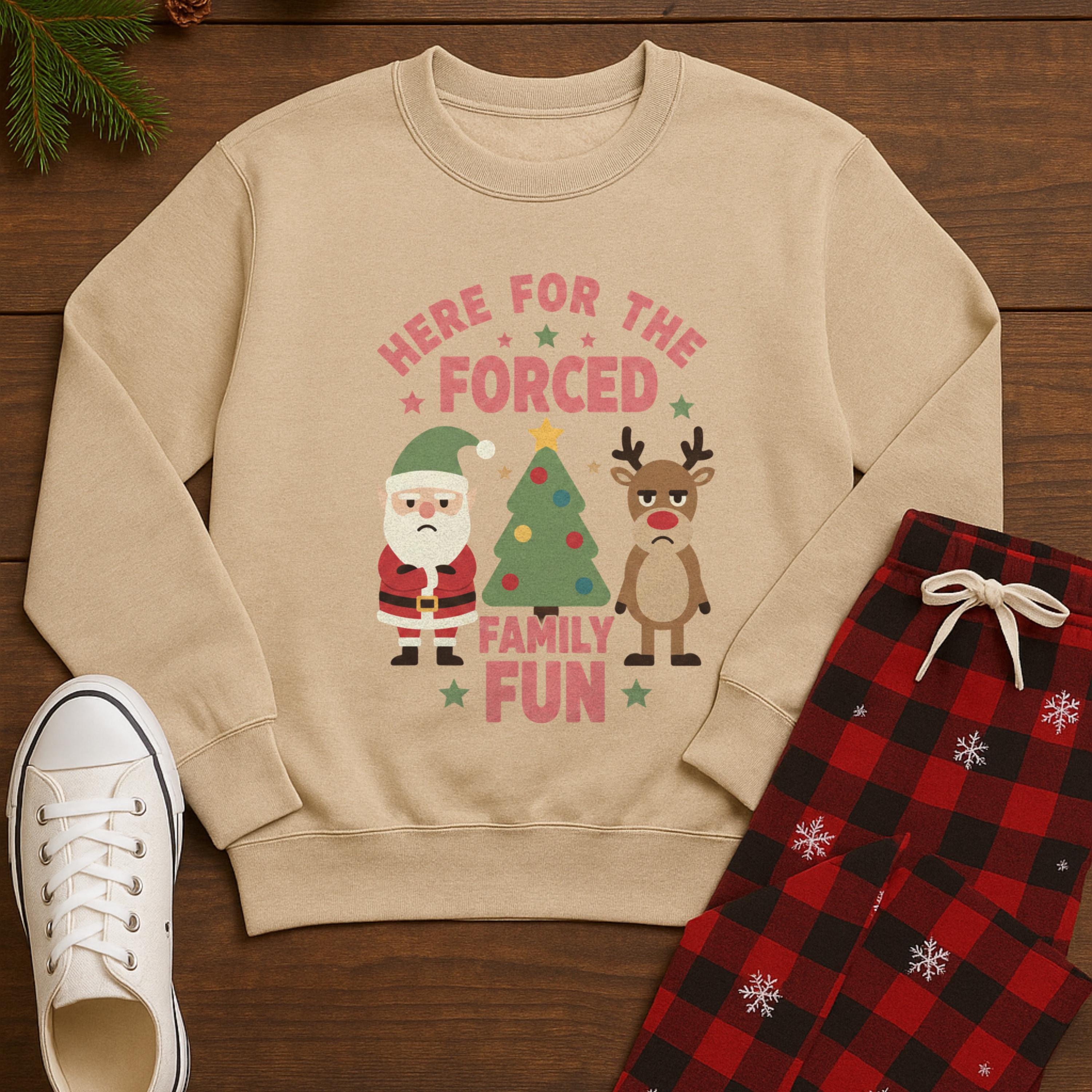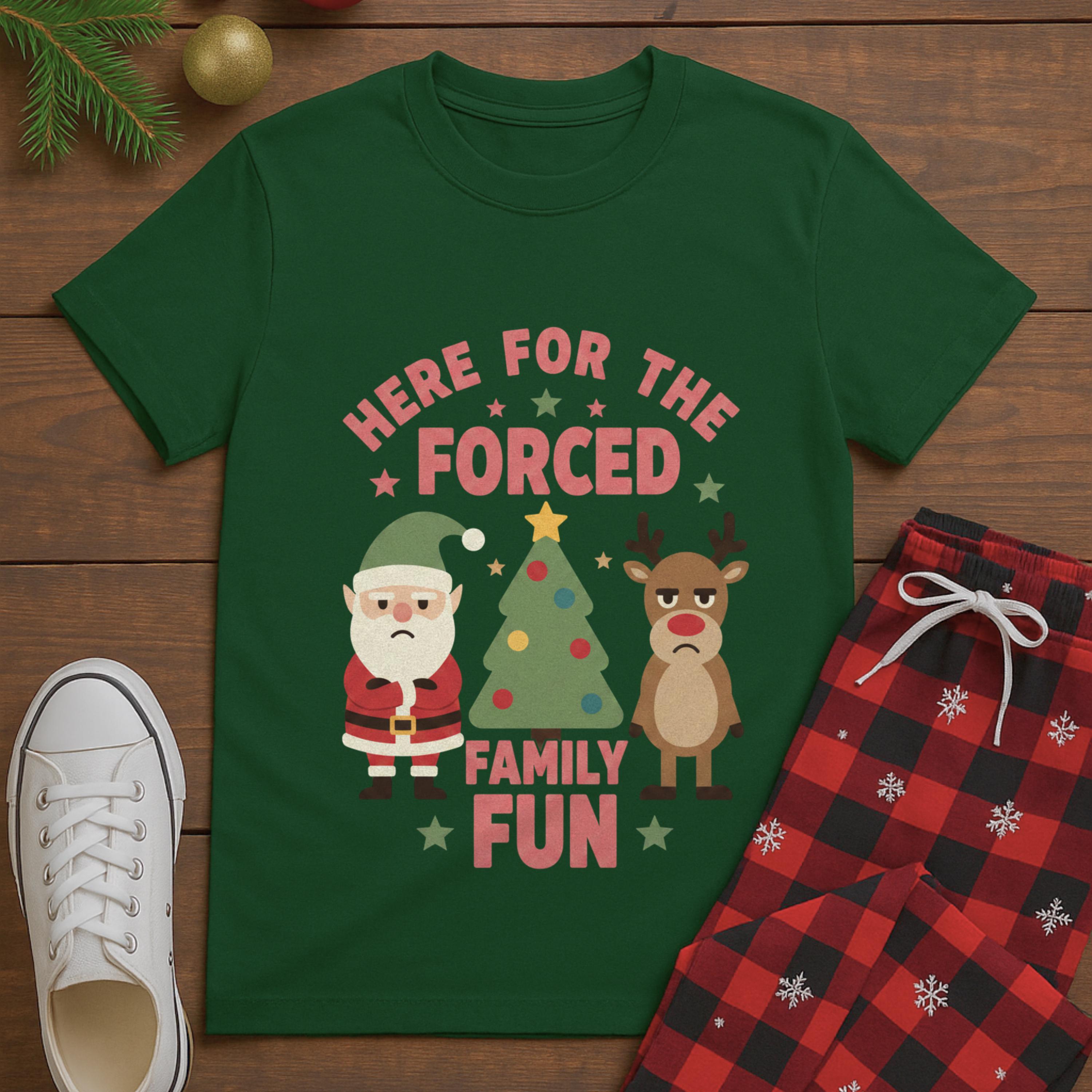 christmas family shirt, sarcastic holiday tee, forced fun gift, xmas joke graphic tee, holiday humor, grumpy reindeer, festive sarcasm, awkward family event, winter humor tee, xmas comedy, funny saying shirt, holiday gathering, gift for her